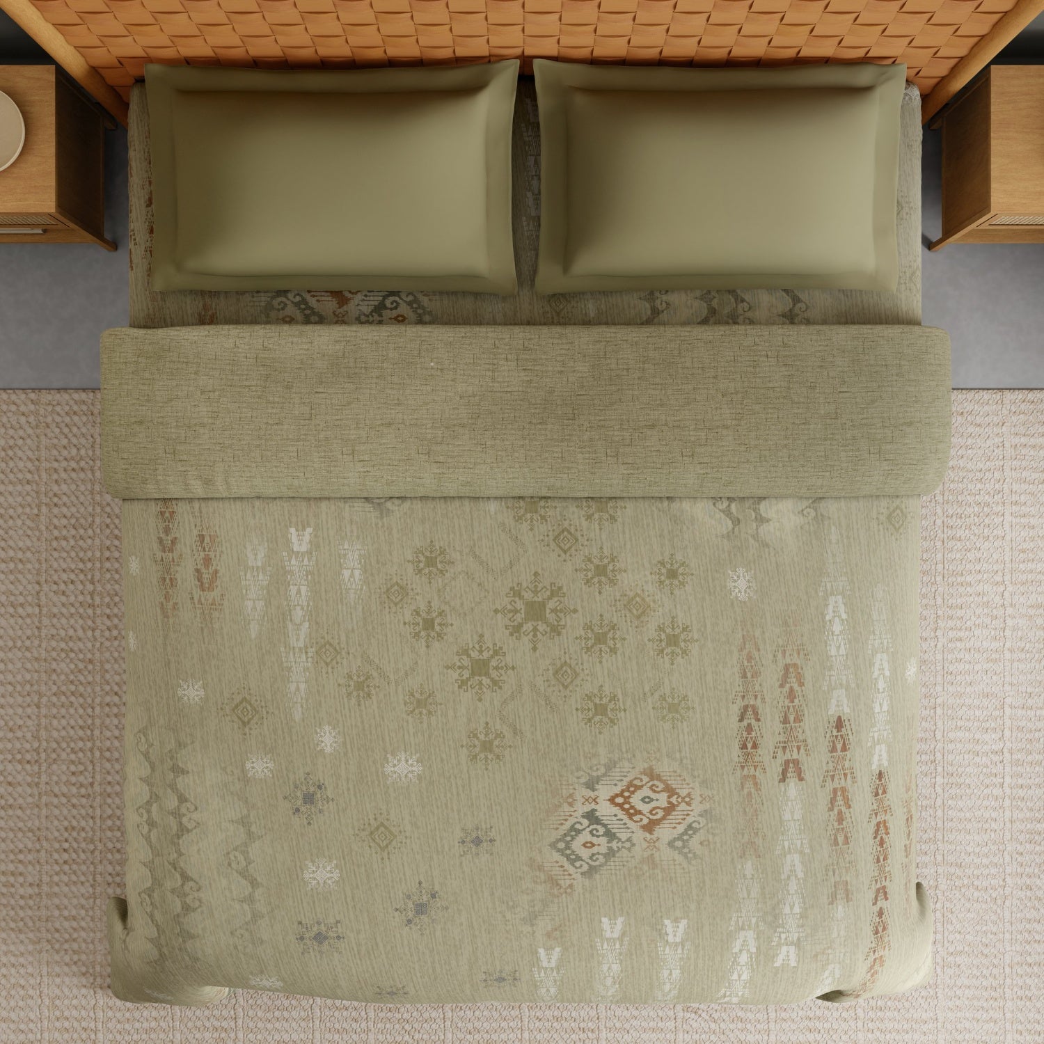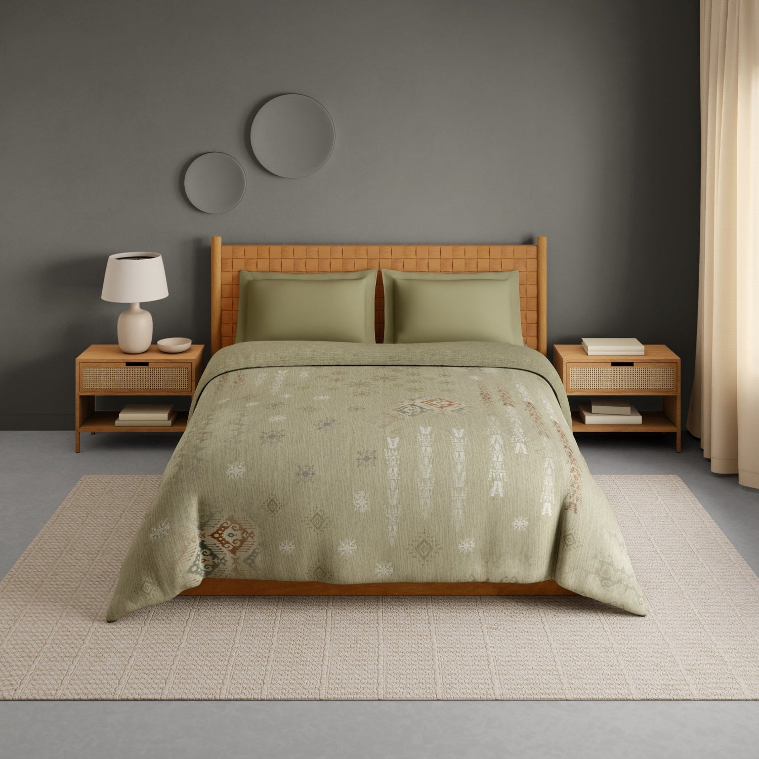 Styled with a detailed geometric design pattern in a deep green shade, the Aztec quilt enhances bedroom décor with a luxurious and traditional appeal. The quilt is thoughtfully made using hundred recycled water, reflecting Spaces’ commitment to responsible and sustainable craftsmanship without compromising on quality or comfort. Its breathable cotton construction ensures warmth without heaviness, making it suitable as a quilt for winter, heavy winter quilt, or even an AC quilt for cooler environments.