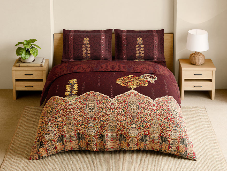 Styled in a rich Maroon tone with a clean floral design, Kalamkari adds depth and sophistication to modern bedroom décor. The generously sized 274 × 274 cm bedsheet provides graceful coverage for large beds, while the set includes four matching pillow covers (43 × 68 cm) for a cohesive, polished look. Designed to be skin-safe and effortlessly comfortable, this collection blends premium fabric, timeless colour, and refined craftsmanship—making it an ideal choice for elevated everyday living.
