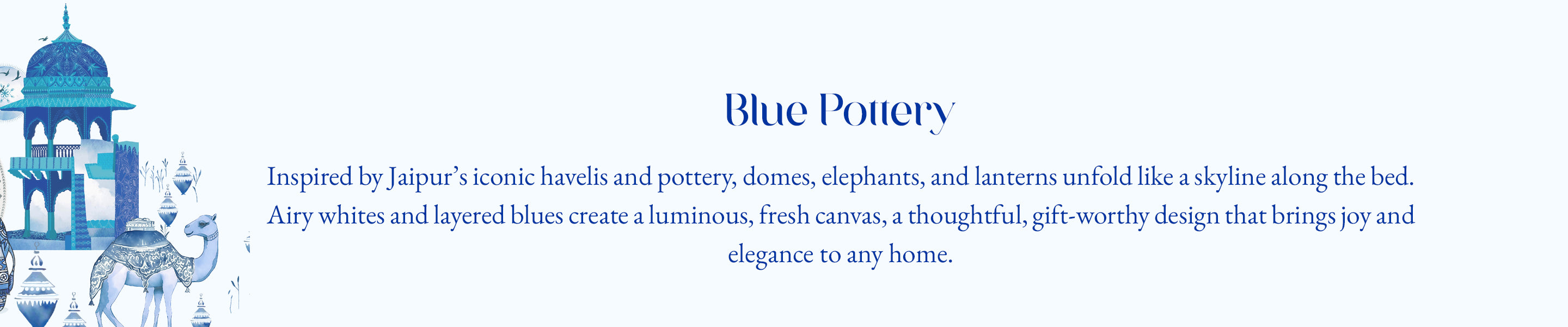 Styled in a rich Light Blue tone with a clean Ornate design, Blue Pottery adds depth and sophistication to modern bedroom décor. The generously sized 274 × 274 cm bedsheet provides graceful coverage for large beds, while the set includes four matching pillow covers (43 × 68 cm) for a cohesive, polished look. Designed to be skin-safe and effortlessly comfortable, this collection blends premium fabric, timeless colour, and refined craftsmanship—making it an ideal choice for elevated everyday living.