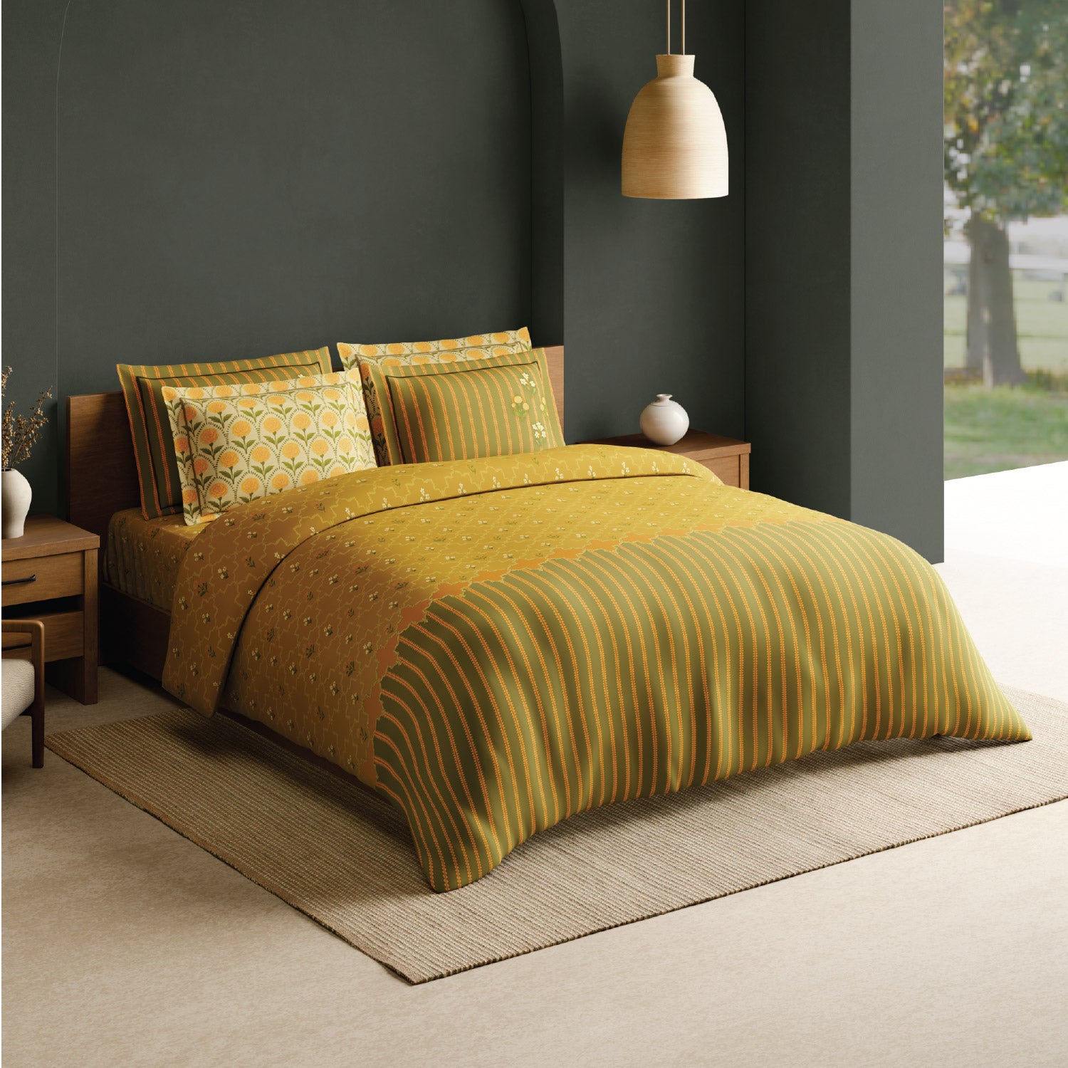 The generously sized 274 x 274 cm (108 x 108 inches) bedsheet provides ample coverage for king and larger beds, while the four matching pillow covers (43 x 68 cm / 17 x 27 inches) complete the coordinated ensemble. The breathable cotton fabric ensures lasting comfort, making it suitable for daily use.