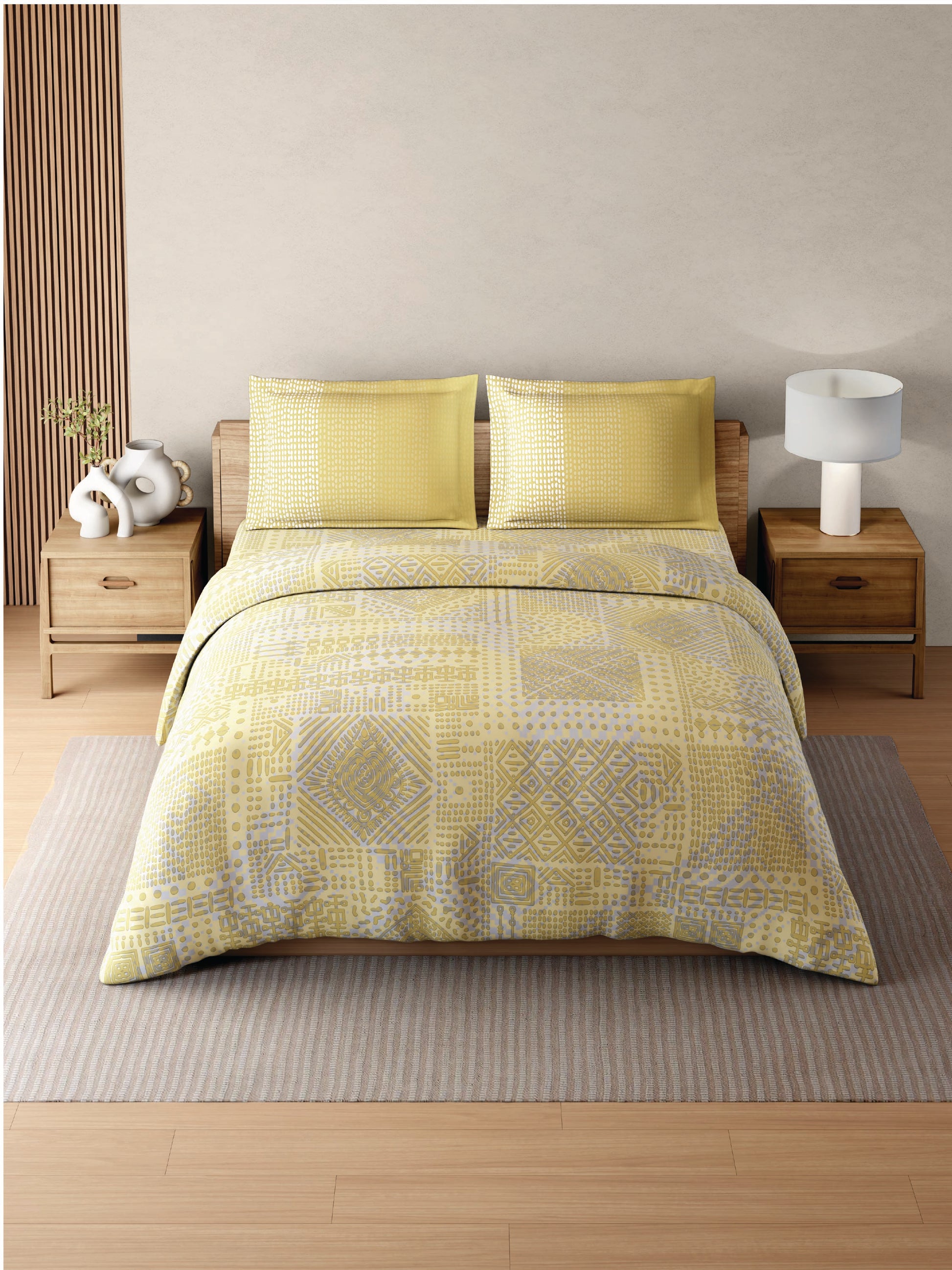 Spaces presents the Zera Bedding Set, a thoughtfully curated combination of a double bedsheet, a matching quilt, and two pillow covers — designed for elevated comfort and modern living. Crafted from premium Hygro Cotton with a 233 thread count percale weave, this bedding set delivers a silky-soft touch, excellent breathability, and a naturally balanced sleep experience.The intelligent Hygro Cotton fabric helps regulate body temperature and moisture, keeping you cool when it’s warm and comfortably warm when the temperature drops. This makes the Zera set ideal for year-round use, whether in air-conditioned rooms or during cooler nights.Styled in a soft Light Yellow shade with a refined Geometric pattern, the set brings calm sophistication to your bedroom without overpowering your décor. The fabric has a smooth finish with just the right amount of crispness, giving it a premium hotel-like feel.The set includes a generously sized double bedsheet (228 x 274 Cm / 90 x 108 Inches), a lightweight yet cozy double quilt (224 x 270 Cm / 88 x 106 Inches), and two pillow covers (43 x 68 Cm / 17 x 27 Inches), creating a complete and coordinated bedding experience. Designed to be as practical as it is beautiful, the Zera set retains its softness, colour, and shape even after repeated washing — making it a luxurious yet easy-care choice for everyday use.