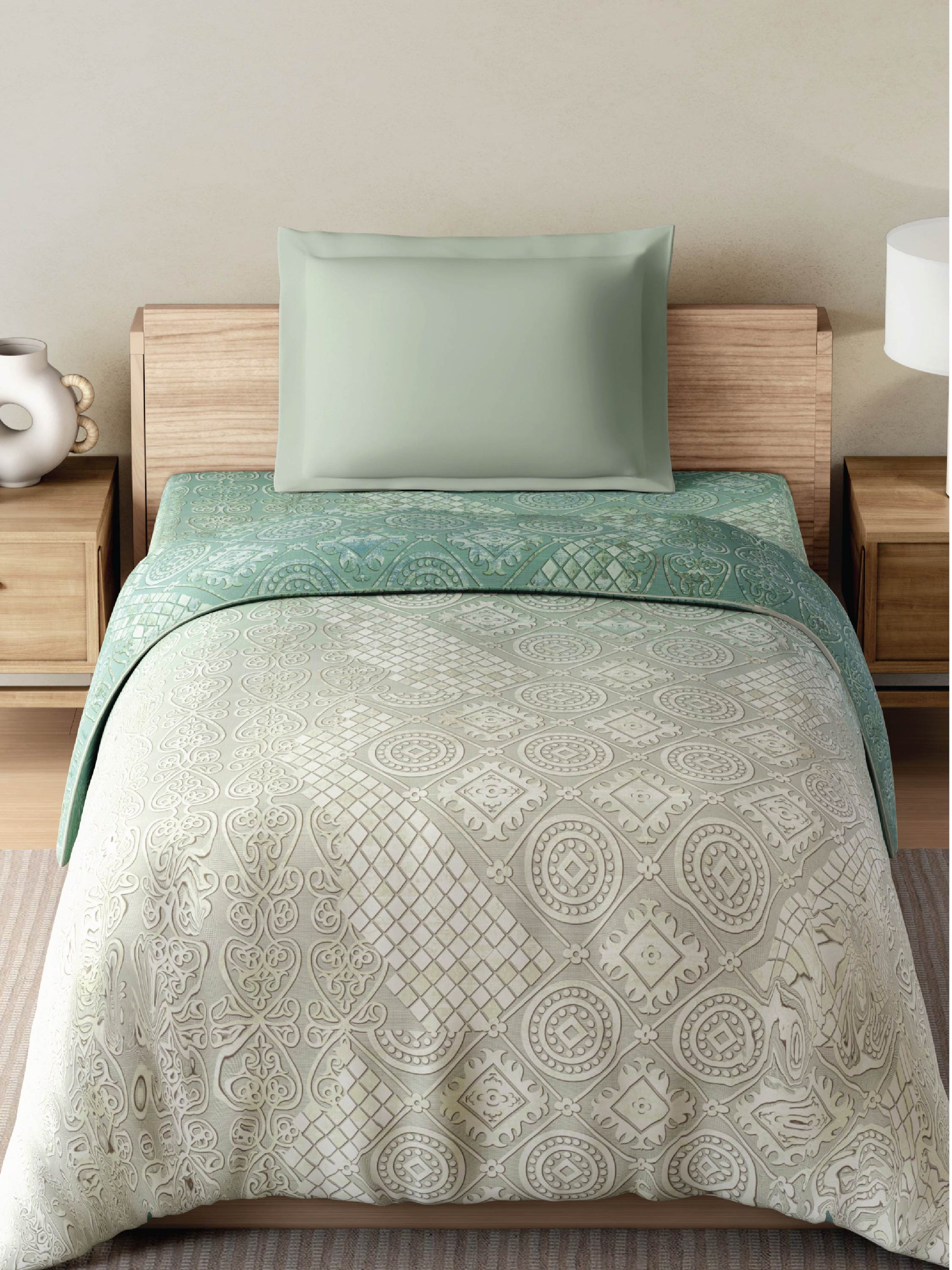 Spaces introduces the Zera Single Quilt, crafted for those who value refined comfort, intelligent fabric performance, and everyday luxury. Made from premium Hygro Cotton with a smooth 233 thread count percale weave, this quilt delivers a super-soft, breathable, and skin-safe touch that feels gentle against the body while maintaining excellent airflow.The advanced Hygro Cotton fabric naturally regulates body temperature, helping you stay cool when the room is warm and comfortably insulated when temperatures drop. This makes the quilt ideal for year-round use, whether in air-conditioned rooms or during mild winter nights. Styled in a calming Light Teal shade with a delicate Ornate pattern, the quilt adds a serene and elegant presence to your bedroom. The percale weave gives it a smooth, crisp finish with a premium hotel-like feel, while the lightweight construction ensures warmth without heaviness.Generously sized at 152 x 220 Cm (41 x 86 Inches), this Single quilt provides ample coverage for Single size beds, draping beautifully for a neat and luxurious look. Designed for premium everyday use, the Spaces Zera Quilt retains its softness, shape, and colour even after repeated washing.