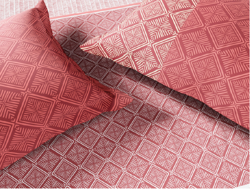 Spaces Fiora 100% Cotton 144 TC Percale Geometric Permium Bedding Set, Dark Red