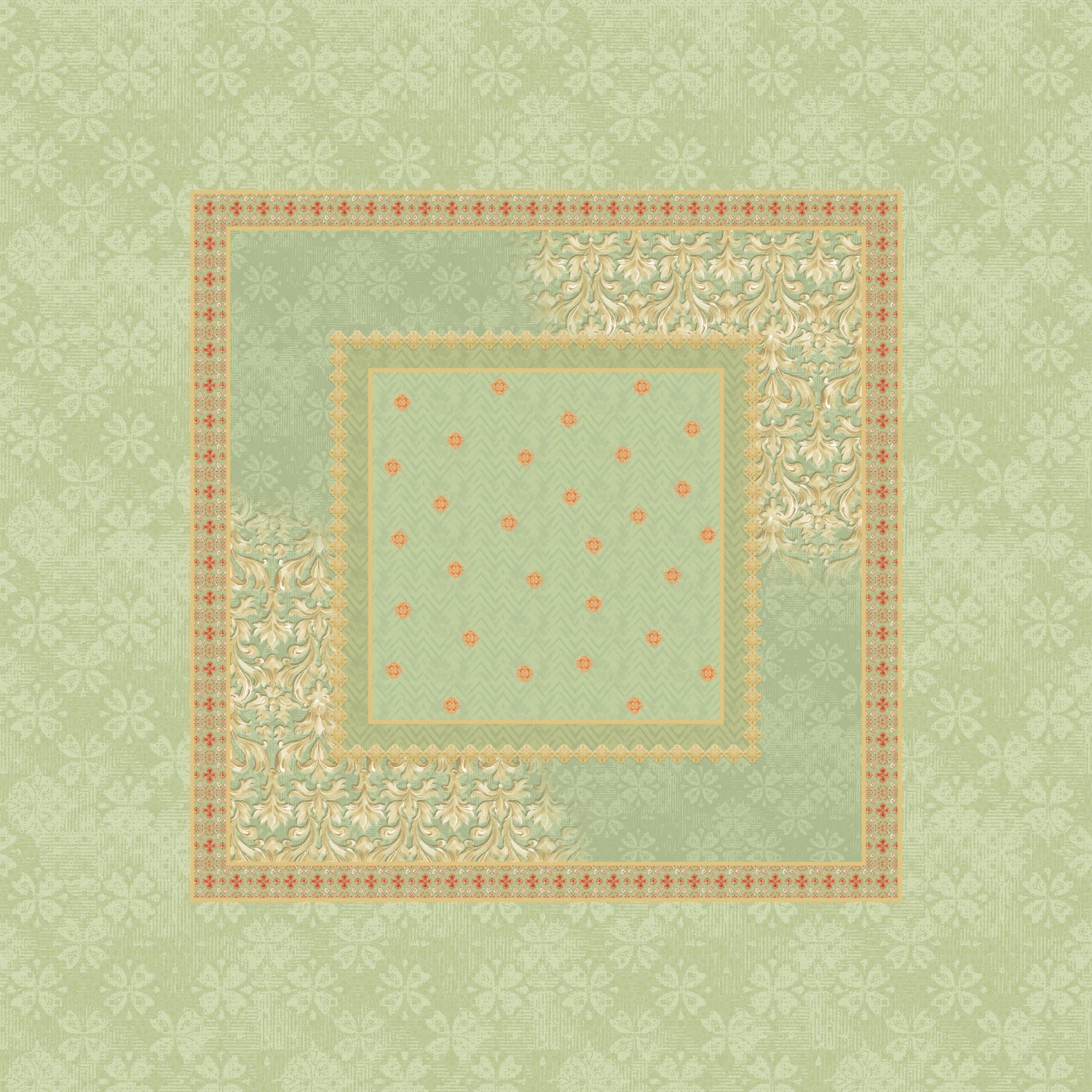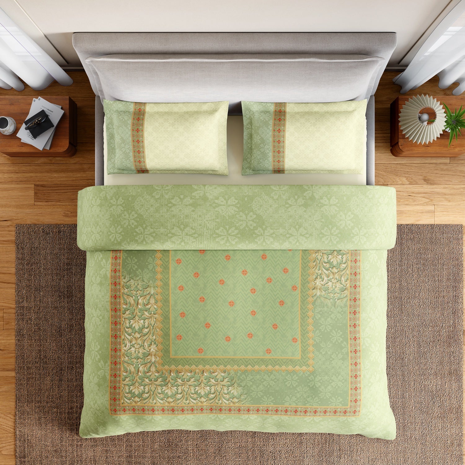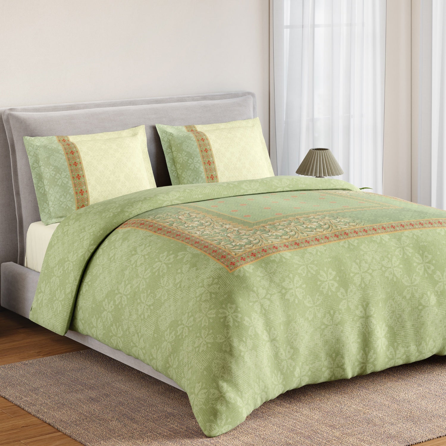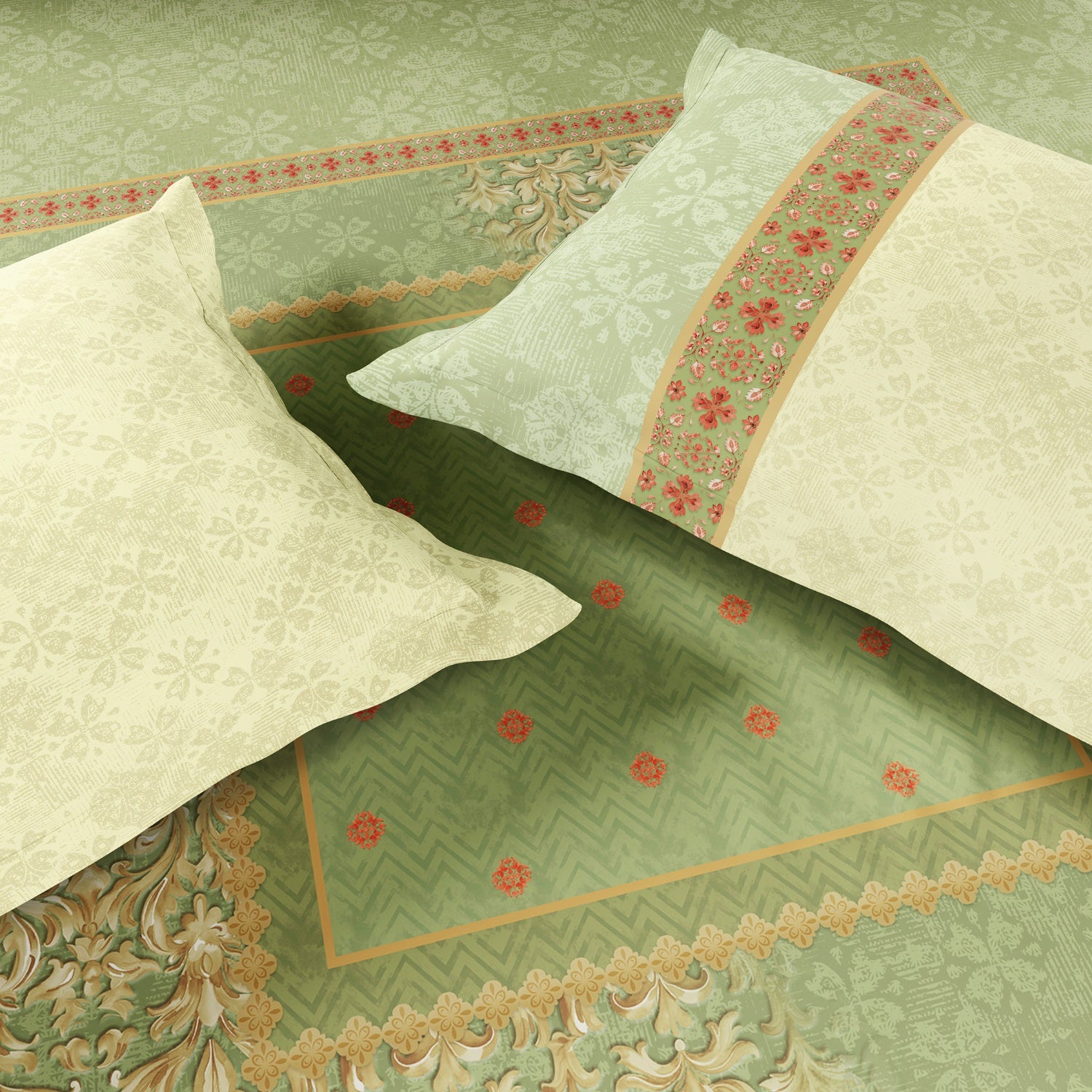 Spaces Summer Carvan 100% Cotton 132 TC Percale Ornate Double Bedsheet with 2 Pillow Covers, Light Green