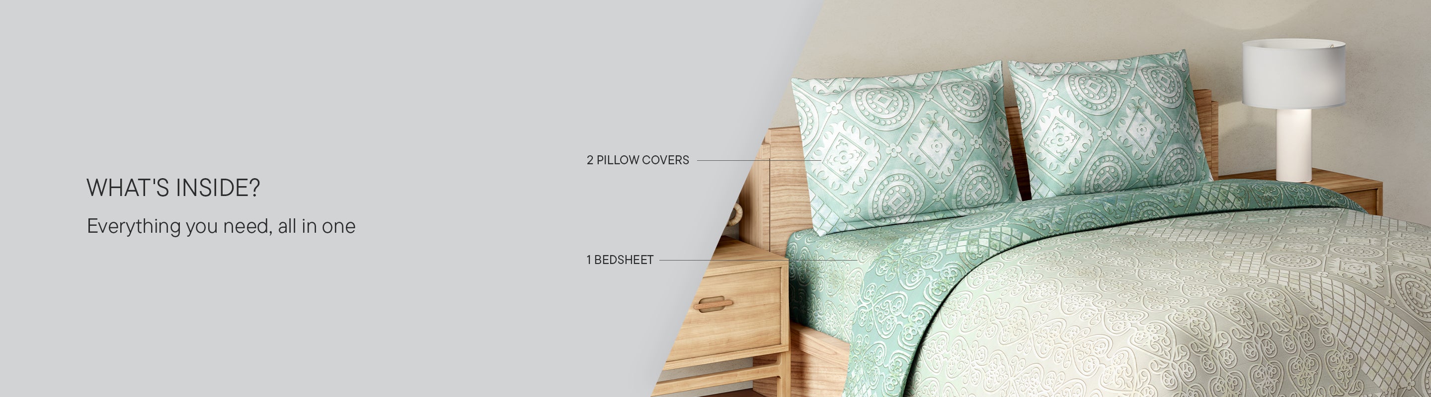 Deminisions : 274CMX274CM/43CMX68CM, Pattern : Ornate, Set Includes : Pack of 1 large bedsheet with 2 pillow covers. Bedsheet size: 274 x 274 Cm (108 x 108 Inches); Pillow covers: 43 x 68 Cm (17 x 27 Inches) — ideal for king-size and large double beds.