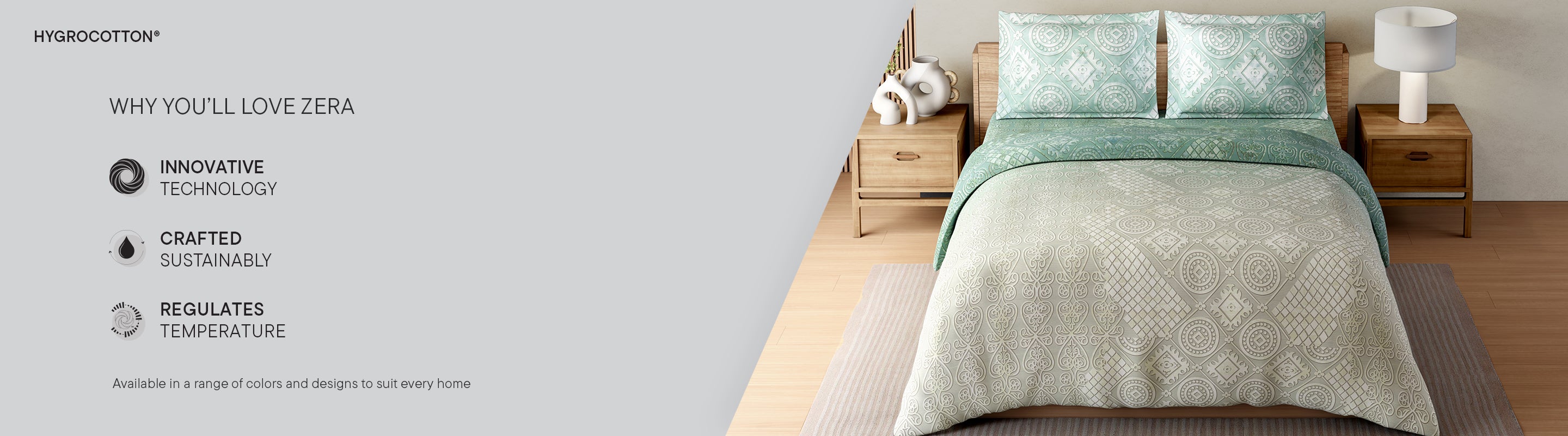 Spaces Zera Large Bedsheet Set is crafted from premium Hygro cotton with a smooth 233 TC percale weave, delivering a luxuriously super-soft, breathable, and skin-safe feel. The advanced Hygro cotton fabric naturally regulates body temperature, helping you stay cool in warmer conditions and comfortably warm when temperatures drop — making it ideal for everyday use across seasons.